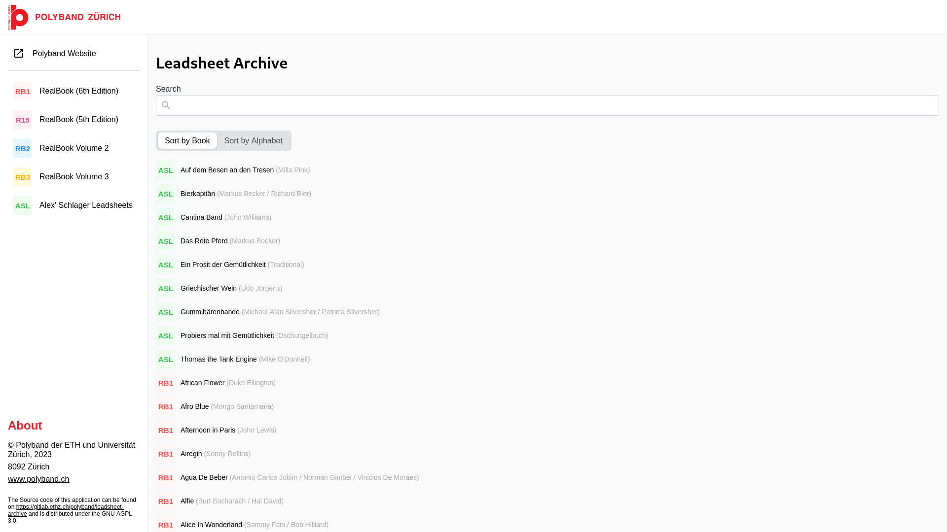 Polyband Leadsheet Archive is an application that makes available in a structured way all the leadsheets of the official Realbooks. It allows searching for a standard and then downloading the leadsheet in the desired key.