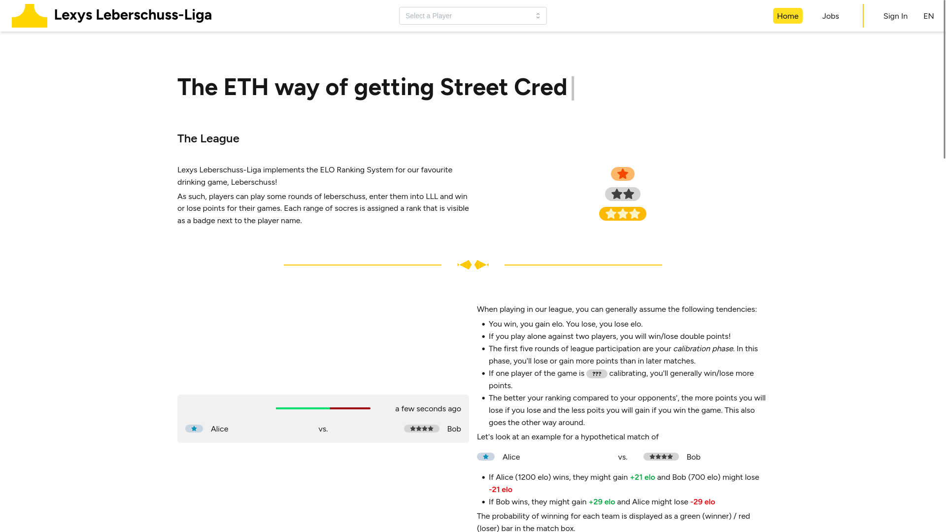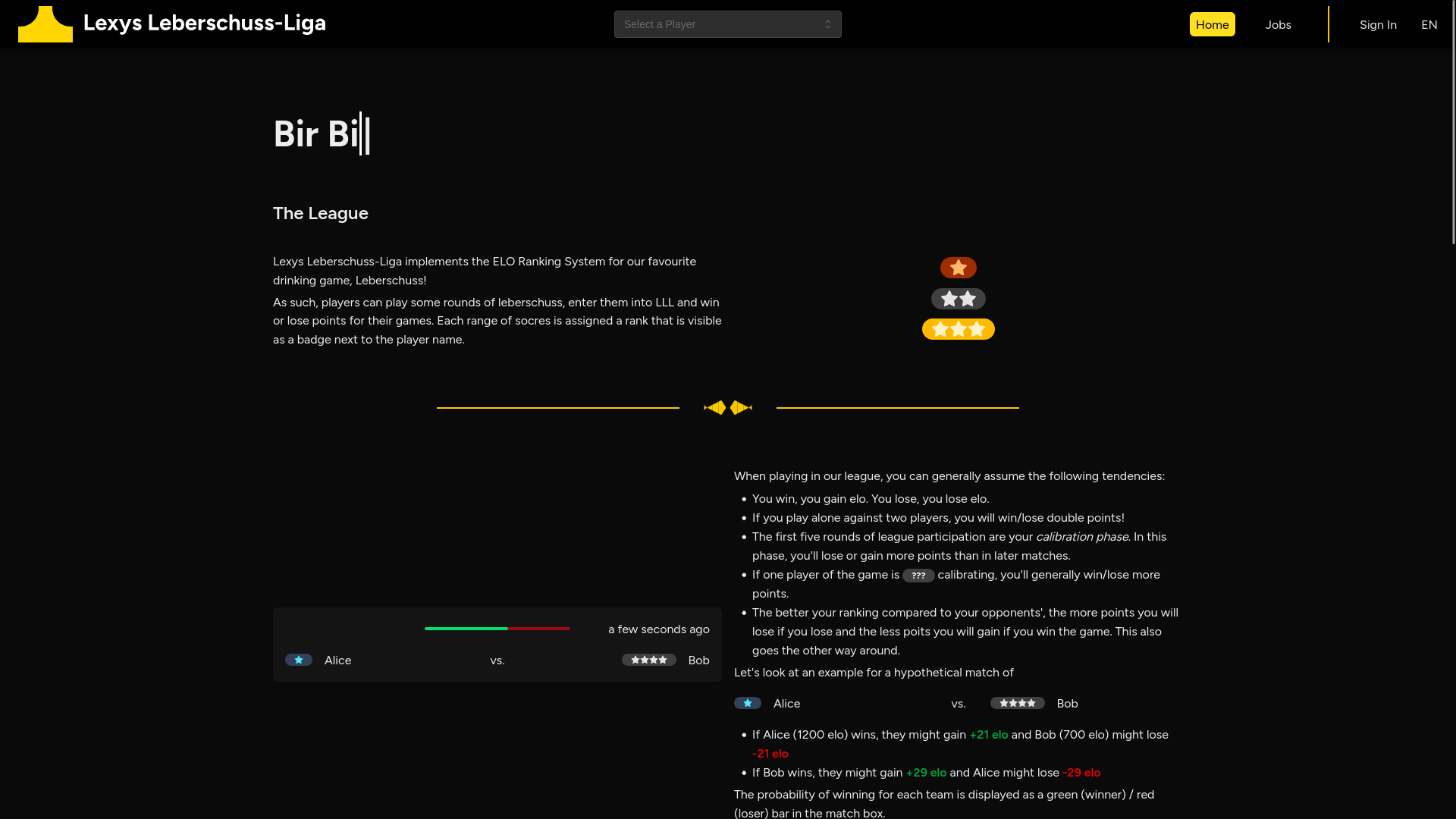 LLL is a platform for ranked Leberschuss, a 2v2 drinking game. It uses the ELO ranking system with some extensions to fit the needs of Leberschuss specifically and assigns ranks to ranges of elo scores.