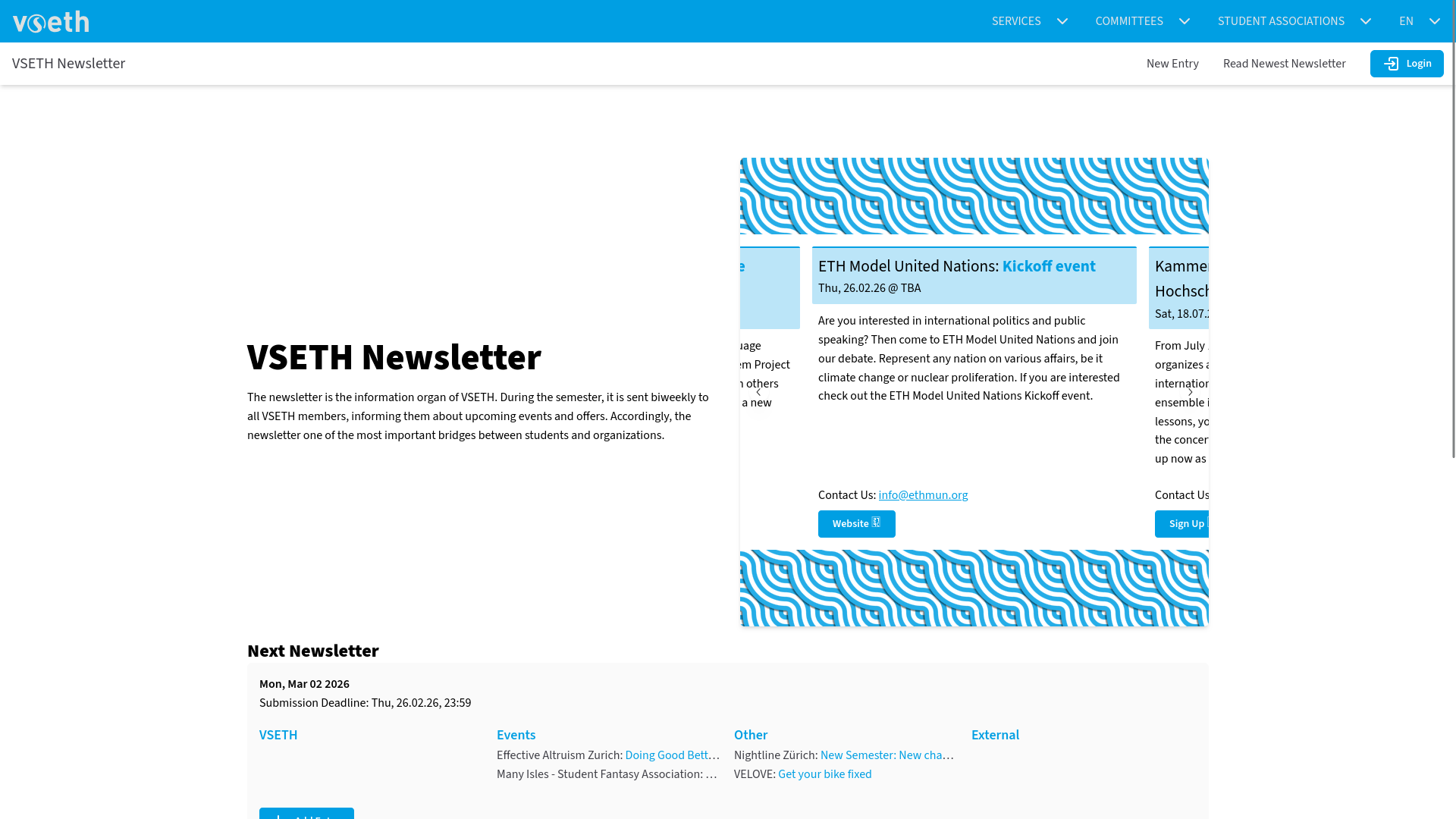 Newsletter is the application that is used by VSETH to check entries and generate and send their by-weekly newsletter. This reduces the work of the communications team to the bare minimum, the rest is done by the tool.